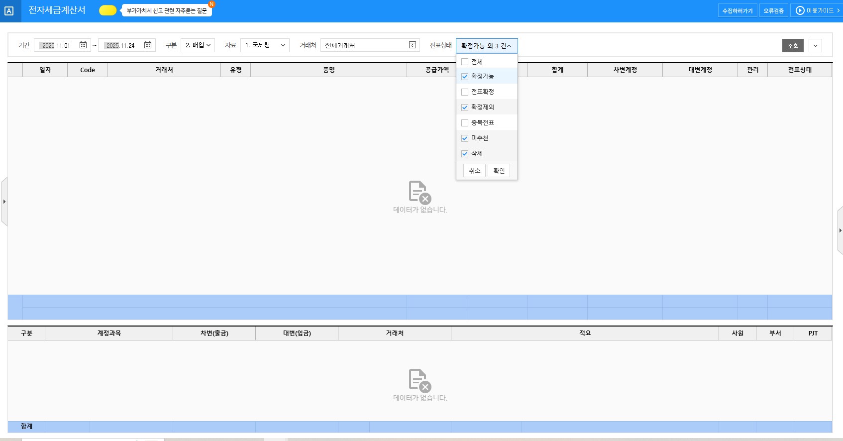 ② 국세청자료 탭에서 검색하면 매입, 매출 동시에 확인 가능