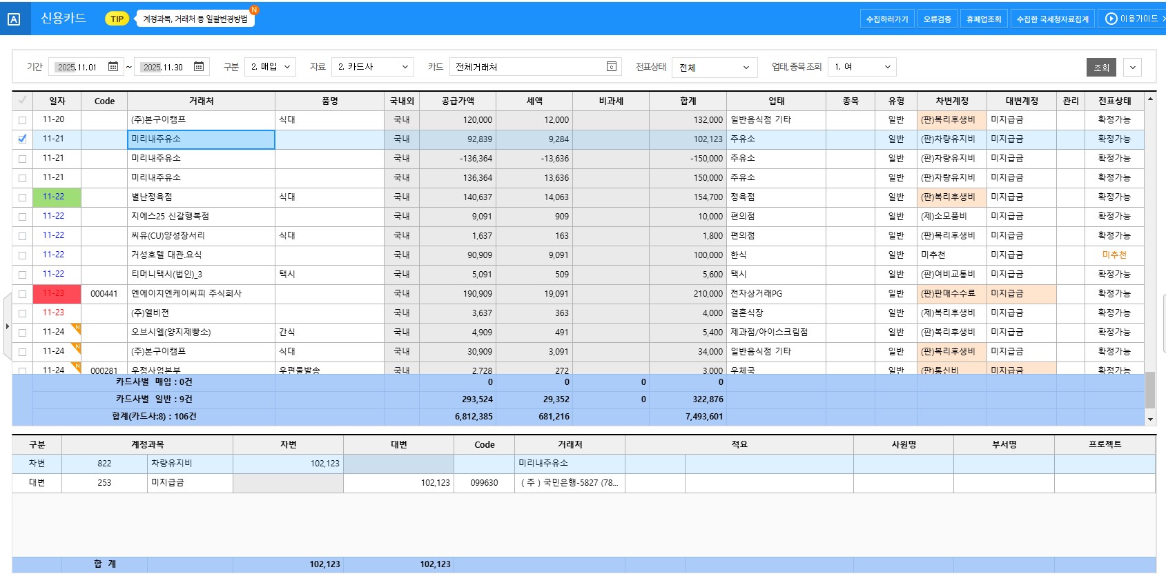 법인카드 승인 내역을 WEHAGO로 자동 불러와서, 각 항목별로 비용 계정과 세금코드를 자동 매칭해 전표를 자동 생성하는 기능입니다.